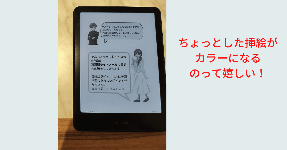 また、私はキンドル端末でライトノベルをよく読むのですが、従来のキンドル端末だと、最初の方にあるカラー挿絵が白黒になってしまうのが残念でした。